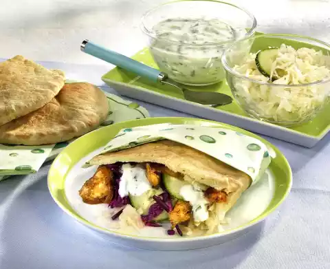Mix yoghurt, garlic, grated cucumber and chives. Season to taste with salt and pepper. Heat up the pan. Fry the meat for 4-5 minutes in the pan, turning it over for 2 minutes. Roast pita pockets in toaster for approx. 3 minutes. Let it cool down briefly, cut one side open. Fill with coleslaw, red cabbage, meat, cucumber slices and sauce