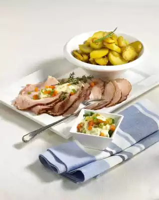 Wash the potatoes and cook for about 20 minutes. Drain, quench briefly, peel and let cool. Wash the cured pork loin. Rub with pepper and thyme. Roast in the preheated oven (electric cooker: 175 °C/circulating air: 150 °C/gas: level 2) for about 45 minutes.
