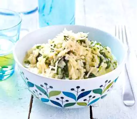 Fold spinach, chives and approx. 3/4 parmesan into the risotto. Continue cooking for 2-3 minutes. Season to taste with salt and pepper. Arrange risotto, sprinkle with rest of parmesan.