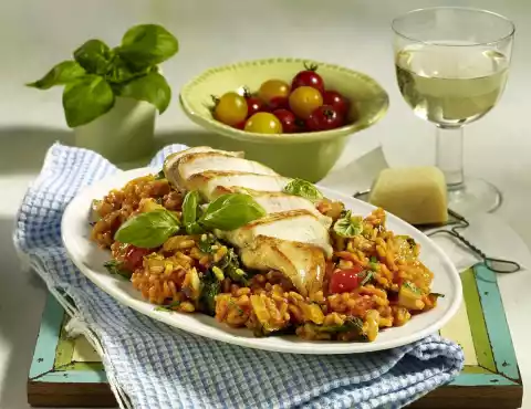 Cut the chicken diagonally into slices and arrange on the risotto and garnish with basil.