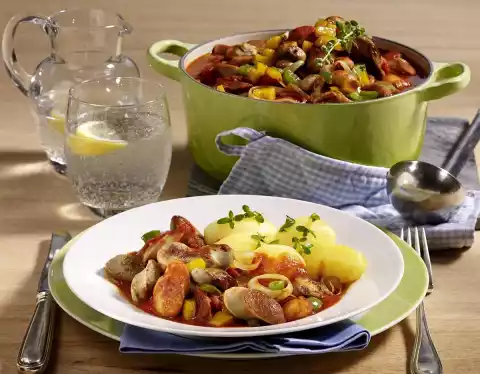 Clean the mushrooms, wash and halve them. Peel and wash the potatoes and cook in boiling salted water for about 20 minutes. Heat the oil in a large pan. Fry sausages, peppers, onions and mushrooms for 3-4 minutes.