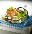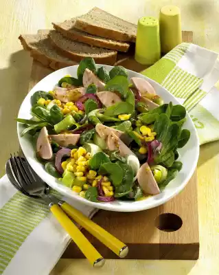 Mix lamb's lettuce, leek, onion rings, corn and poultry sausage and drizzle with salad dressing. Farmers crusty bread goes well with it.