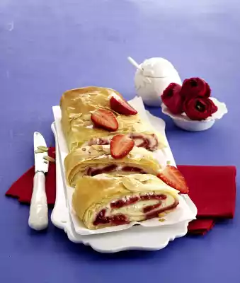 Spread the quark mixture lengthwise over half of the surface of the dough, leaving an approx. 4 cm wide rim. Spread strawberry slices on top. Fold the edges of the dough over the quark mixture. Roll up from the coated side using a tea towel. Slide the strudel with the seam side down onto a baking tray lined with baking paper
