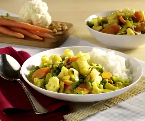 Prepare rice in boiling salted water according to package instructions. Cook cauliflower and carrots in a pot with boiling salted water for about 10 minutes. Add the leek 3 minutes before the end of the cooking time. Drain the vegetables. Roast peanuts in a pan without fat. Heat the oil in a pot and fry the onion cubes in it with the curry paste and powder. Deglaze with coconut milk and broth, bring to the boil. Season with salt and pepper. Mix the starch with a little water and thicken the sauce with it.