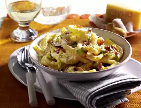 Cook the pasta in boiling salted water according to the instructions on the packet. Clean and wash the leek and cut into fine rings. Clean, wash and slice the mushrooms. Heat the oil in a large pan.