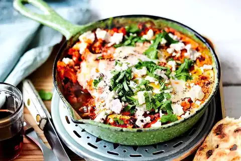 With a spoon press 4 hollows into the tomatoes. Break open the eggs and spread them in the hollows. Leave to set in the closed pan over medium heat for about 10 minutes.