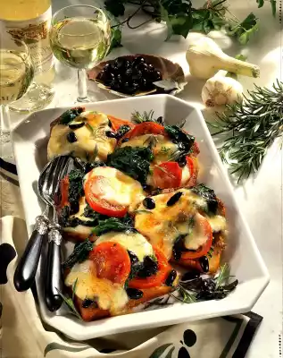 Cut olives into slices. Place slices of bread on a baking tray lined with baking paper and cover with spinach, tomatoes, olives and mozzarella. Drizzle with the remaining oil. Bake the bread in a preheated oven (electric: 200 °C/ gas: level 3) for 12-15 minutes.