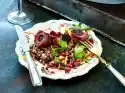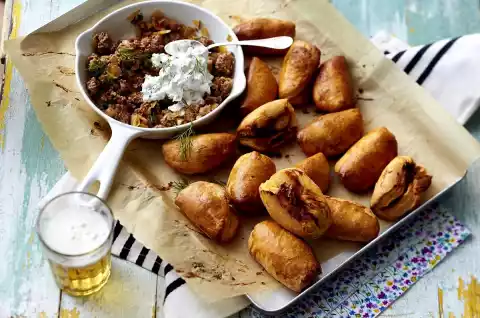 Take pirogi out of the oven, arrange with dip and remaining mince.