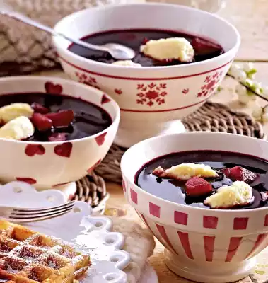 Boil up juices, spices, 200 g sugar, lemon peel and juice. Stir starch and 5 tablespoons of water until smooth. Bind soup with it. Season to taste.