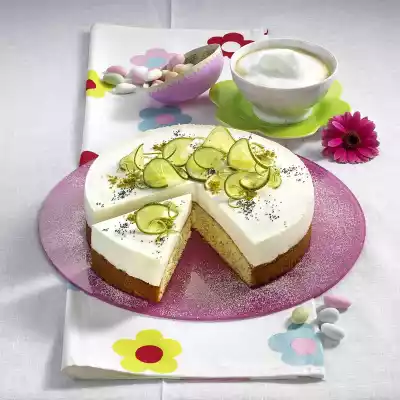 Take out the cake and let it cool down. Soak gelatine in cold water for 10 minutes. Wash and halve 1 lime. Rub the peel off one half and squeeze the juice. Cut the other half into thin slices for decoration. Whip cream until stiff. Mix quark, 1/2 cup of sugar, lime zest and juice of the two half limes. Squeeze the gelatine, dissolve and mix with 3 tablespoons of the quark cream. Stir the gelatine into the quark cream. Fold in the cream. Carefully remove the cake from the mould and the base. Put the cake back into the mould and spread the quark cream on top.