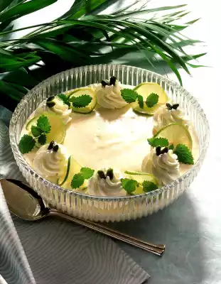 Beat 200 g cream and egg white separately until stiff and fold into the lime cream with the whisk. Pour the cream into a bowl and allow to set in the fridge. Whip remaining cream and vanilla sugar until stiff. Pour into a piping bag with a star-shaped spout and spray dots onto the cream. Cut remaining lime into thin slices, cut half on one side and turn into wheels. Decorate the cream with lime wheels, lemon balm and pistachios