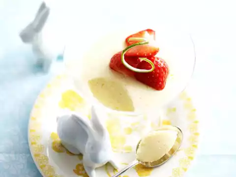 Wash, clean and halve the strawberries and put them in a bowl. Put 5 tablespoons of strawberries with 1 tablespoon of sugar into a mixing cup and puree finely with a hand blender. Decorate lime cream shortly before serving with strawberries, strawberry sauce and lime strips.