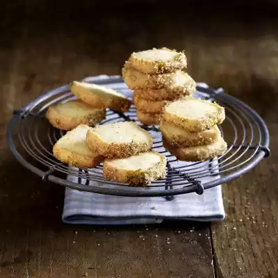 Halve the dough and form it into a roll (32 cm long). Use a long ruler to shape each roll into a square stick (3 x 3 x 32 cm). Roll in lime sugar, press it down and put it in a cool place for about 1 hour. Then cut each stick into 1 cm thick slices and place on 2 baking trays lined with baking paper. Bake one after the other in a preheated oven (electric cooker: 200 °C/ convection oven: 175 °C/ gas: level 3) for about 12 minutes. Place on a cake rack, allow to cool and pack in tins