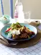 Wash, clean and halve the tomatoes. Heat the oiven oil in a pan, place the tomatoes with the cut side in the hot oil and braise at medium heat for 15-18 minutes. Add the garlic about 5 minutes before the end of the braising time. Then turn carefully and season with salt and pepper. In the meantime, wash the lime thoroughly and cut into slices. Remove the meat from the marinade and dab dry with kitchen paper. Heat oil in a pan and fry meat for 2-3 minutes on each side. Add the slices of lime shortly before the end of the frying time. Season cutlets with salt and pepper.
