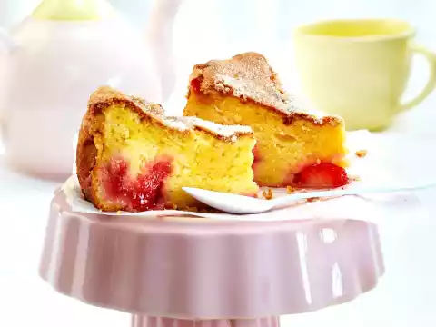 Fold the beaten egg white into the dough in 3 portions. Wash, clean and halve the strawberries. Put half the dough into the mould. Spread the strawberries on top, add the rest of the dough and smooth it down. Sprinkle with 1 tablespoon of sugar.