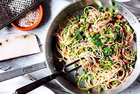 Add the pasta to the pan. Add frozen peas and pasta water. Bring to the boil and simmer for about 2 minutes. Add everything to the egg mixture and mix in immediately. Season to taste with salt and pepper. Sprinkle with mint.