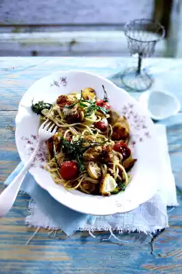 Cook the pasta in plenty of salted water according to the package instructions. Clean the pan again, heat 3 tablespoons of olive oil and fry the mushrooms in it, turning them well. Remove from the pan. Pour 2 tbsp. oil into the hot pan, fry the tomatoes for 3-4 minutes, turning them over. Add the mushrooms and sugar to the tomatoes, caramelise briefly and season with salt and pepper. Deglaze with vinegar and about 150 ml pasta water. Let simmer for about 1 minute