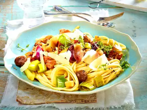 In the meantime heat the oil in a large pan. Fry the cured pork, celery and chestnuts for approx. 3 minutes, turning until golden brown. Add leek and onions. Season with salt and pepper. Add stock and simmer covered for about 5 minutes.