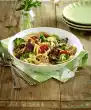 Stir in the sauce thickener. Drain the pasta, collecting approx. 100 ml of cooking water. Pour pasta with measured cooking water into the pan. Fold in, season to taste with salt and pepper. Arrange noodles and braised vegetables on plates.
