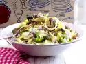Add 5-6 tablespoons of pasta water to the vegetables. Drain noodles. Mix with the vegetables. Serve immediately.