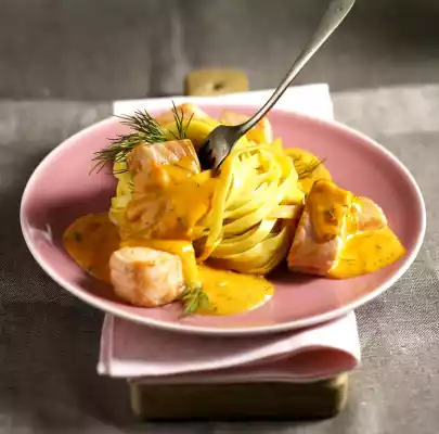 Chop the dill finely and stir into the sauce. Add salmon and fold in carefully. Arrange noodles and salmon sauce on plates. Garnish with remaining dill.