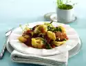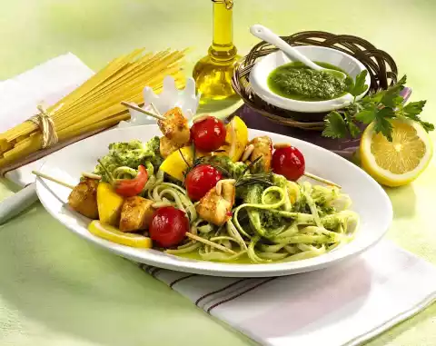 Carve the chillies lengthwise, remove seeds and cut finely. Heat the oil. Fry skewers in it at medium heat for 5-7 minutes. Season with salt, chilli and rosemary. Cook pasta in plenty of boiling salted water for 6 minutes, drain and mix with pesto. Arrange linguine and skewers sprinkled with remaining pine nuts. Serve garnished with lemon