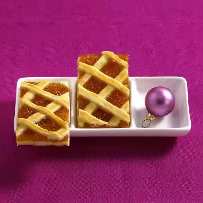 Spread the apricot mixture on the dough. Roll out the remaining dough to a rectangle (approx. 45 x 20 cm). Whisk egg yolk and milk, spread on the rectangle. Cut lengthwise into strips about 1 cm wide, place the strips diagonally crosswise at about 3 cm intervals on the apricot mixture. Bake in the preheated oven (electric cooker: 175 °C/ convection oven: 150 °C/ gas: level 2) for about 20 minutes. Let the pastry cool down on a cake rack. Cut into rectangles (approx. 4 x 6 cm)