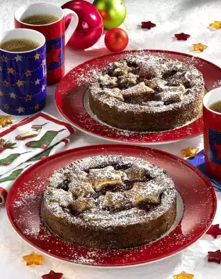 Spread 150 g jam evenly on each base. Bake in the preheated oven (electric: 200 °C/ gas: level 3) for 40-45 minutes on the lowest rack. In the meantime, roll out the remaining dough on a floured work surface and cut out cookies with different Christmas motifs (e.g. stars). After about 10 minutes of baking time, spread the cut-out dough evenly over the two cakes and bake with them. Remove from the oven, place on a grid, remove from the edge of the springform pan and allow to cool in the pans. Then remove from the moulds and serve dusted with icing sugar