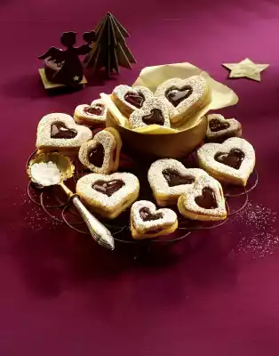 3-4 Line baking trays with baking paper. Divide the dough into three. Roll out 1 piece of dough between 2 layers of baking paper approx. 2 mm thin. Cut out hearts with a large heart cutter (approx. 6 cm Ø), cut out 1 smaller heart (approx. 3 cm Ø) from each half of the cookies in the middle. Place whole hearts and hearts with hole on a baking tray. Knead the remainder with the 2nd third, roll out and process in the same way until approx. 20 whole hearts and 20 hearts with a hole are produced. Bake the trays one after the other in a preheated oven (electric cooker: 175 °C/ convection oven: 150 °C/ gas: level 2) for approx. 10 minutes