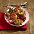 Turn with the help of a flat lid. Bake in the same way from the other side. Bake 4 more Pickerts from the remaining bacon and dough. Bake the raisin Pickerts the same way. Serve with butter. Serve with the bacon Pickerts liverwurst and with the raisin Pickerts jam and dark beet syrup.