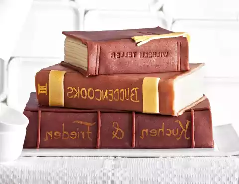 For bookmarks and book spine decoration, roll out Rest Marzipan approx. 2 mm thin and cut to size as desired. Moisten with a little water. Decorate books with it. Mix golden colour with oil. Paint bookmarks and book spine decorations with it, title the books.
