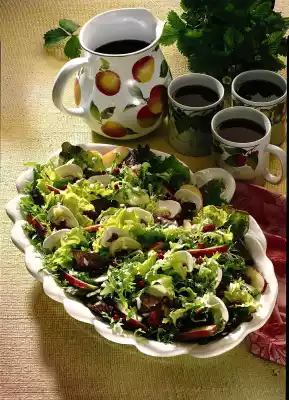 Clean, wash and pluck the salads into bite-sized pieces. Wash and quarter apples, remove core and cut apples into slices. Wash and slice the mushrooms. Sprinkle both with lemon juice. Peel and finely dice the shallots. Mix vinegar, salt, pepper, sugar and diced shallots, stir in oil.