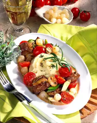 Add the mushrooms and also fry. Then add spring onions, tomatoes and silver onions to the pan and braise briefly. Season with salt and pepper and deglaze with stock and cream. Bring to the boil, cover and cook for about 1 minute. In the meantime, bring 150 ml water and milk to the boil in a saucepan. Remove from the heat, sprinkle in mashed potatoes and mix with a whisk. Season to taste with salt and nutmeg. Wash the thyme, dab dry and pluck the leaves from the stalks. Heat the remaining fat and toss the thyme in it.