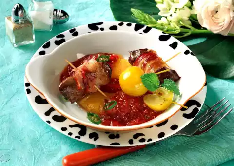 Wash the liver, pat dry and cut in half. Wrap one slice of bacon around each and pin it with wooden sticks. Fry in hot oil for about 5 minutes, season and remove. Keep liver skewers warm.