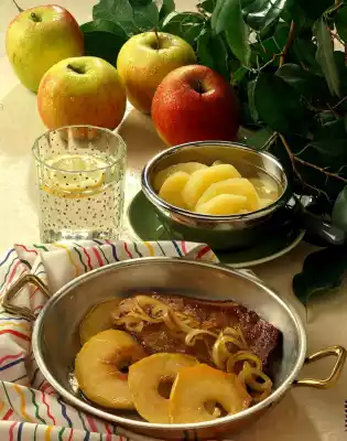 Remove, season with salt and pepper and keep warm. Add onion rings and apple rings to the frying fat and fry in it. Add liver again and serve together. Add the apple compote.