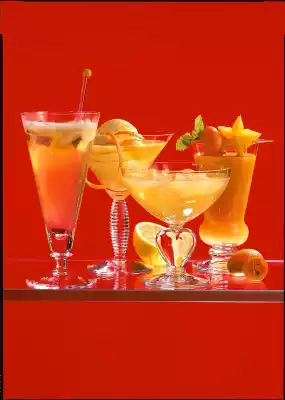 Crush ice cubes and put them in a glass. Mix passion fruit nectar, mango syrup, cognac and liqueur in a shaker and pour onto the ice. Fill up with orange juice