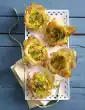Arrange breads with 1 slice of ham, some sauce hollandaise and 1 egg. Sprinkle with chives. Garnish