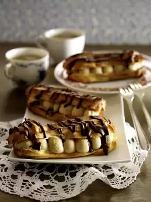 Remove the milk from the heat and stir in the mixed powder. Bring to the boil while stirring and cook for at least 1 minute. Pour the pudding into a bowl and cover the surface with foil. Put the pudding in a cool place. Stir the remaining eggs into the choux pastry. Pour the mixture into a piping bag with a large star-shaped spout. Line 2 baking trays with baking paper and spray approx. 12 strips (each 9 cm long) on top. Fill an ovenproof dish with water and place on the bottom of the oven. Bake the trays one after the other in a preheated oven (electric range: 225 °C/ convection oven: 200 °C/ gas: level 4) for 25-30 minutes. About 10 minutes before the end of the baking time, cover the eclairs with aluminium foil if necessary. Remove the éclairs from the oven, immediately cut them in half horizontally and let them cool down on a cake rack. Roughly chop the chocolate and melt in a bowl over a warm water bath. Stir the pudding with a whisk until smooth.