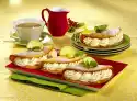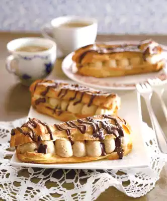 Pour the mixture into a piping bag with a large star-shaped spout. Spray approx. 12 strips (each approx. 9 cm long) onto 2 baking trays lined with baking paper. Put water in an ovenproof dish in the oven. Bake one after the other in the preheated oven (electric oven: 200°C/circulating air: 175°C/gas: level 3) for 25-30 minutes. Cover the lover's bones after 20 minutes if necessary. Immediately cut open horizontally and let cool off
