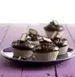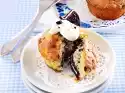 Mexa o pudim até ficar liso. ##Creme### Bater até ficar duro e dobrar para dentro. Deite creme num saco de tubagem com bico perfurado e esguiche para as metades inferiores. Ponha a tampa em cima
