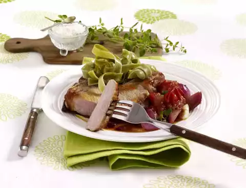 Drain the pasta. Remove the meat and arrange on preheated plates with melted tomatoes and noodles.