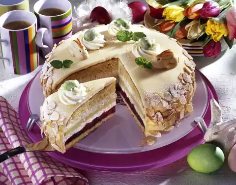 Whip 500 g whipped cream and 1 tablespoon sugar until stiff, fold in liqueur, ground almonds, except for 1-2 teaspoons. Spread about 1/3 of the almond cream on the cherries and cover with the 2nd base. Spread the rest of the almond cream on top and cover with the 3rd base. Chill the cake for 20-30 minutes. Whip 250 g cream and 1 tablespoon sugar until stiff. Remove the cake from the cake ring and spread a thin layer of cream all around. Put the rest of the cream in a piping bag with star-shaped spout and chill. Place the marzipan cover on the cake, press the sides well together. Cut off any excess marzipan all around. Warm up the jam, pass through a sieve and spread on the cake's edge. Press almond flakes to the edge and dust with icing sugar. Decorate the cake as you like with cream tuffs, marzipan bunnies, Easter eggs and mint. Sprinkle the remaining ground almonds over the cream tuffs. Keep cool until serving