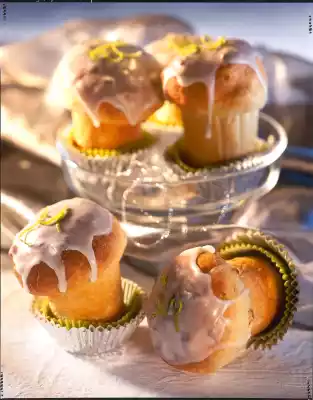 Gradually add the melted fat and the sugar and egg mixture. Knead for about 5 minutes to a smooth dough. Add lime zest and apricots and knead. Form dough into 10-12 balls with floured hands. Grease the moulds (approx. 6 cm Ø, 6 cm high, 1/8 litre capacity) and add one ball of dough at a time so that the moulds are filled to the brim. Leave in a warm place for another 10 minutes. Place on a baking tray and bake in the preheated oven (electric oven: 200 °C/ gas: level 3) on the 2nd rack from below for approx. 15 minutes. Let it cool down and take it out of the baking trays. Mix icing sugar and lime juice and dip the lucky mushrooms in it, drip off, allow to dry slightly and sprinkle with lime peel strips as desired. Place in paper cuffs and serve. Makes 10-12 pieces