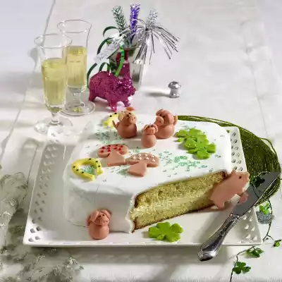 Spread the butter cream on the bottom cake layer, smooth it down and cover with the second layer. Chill the cake for about 2 hours. Knead the raw marzipan mixture and 100 g icing sugar. Heat the jam and pass through a sieve. Remove the cake from the tin and spread jam all around. Weigh 350 g marzipan paste and roll out on a work surface dusted with icing sugar to a square plate (approx. 36 x 36 cm). Place the marzipan plate evenly and smoothly over the cake, spread the edges well and press them on. Cut off any excess marzipan. Leave the cake to stand for approx. 3 hours to allow the marzipan to dry. Knead the rest of the marzipan mixture (approx. 150 g) and the remains of the marzipan top. Dye approx. 100 g with red food colouring pink and shape or cut out piglets as you like. Colour the rest of the mixture green and yellow and cut out clover leaves and horseshoes. Decorate with sugar lettering. Mix egg white, 375 g icing sugar and 1-2 tbsp. lemon juice to a smooth thick icing. Spread the glaze evenly over the cake and decorate with the marzipan lucky charms. Sprinkle with green decoration sugar. Let the cake dry for 5-6 hours