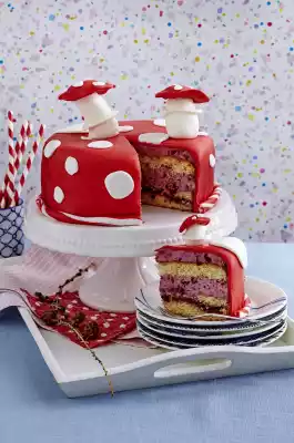 Roll out about half of the remaining white fondant, cut out circles of different sizes and decorate the cake and mushrooms with it. Place the mushrooms on the cake. Roll out the rest of the red and white fondant into one long strand, tie them together, roll them out again a little and twist the strand again.