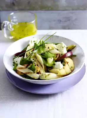 Pluck/cut the mozzarella into pieces. Mix vinegar, mustard and maple syrup and season with salt and pepper. Add oil and season to taste again. Add chive rolls. Mix spinach, peaches, asparagus, mozzarella and vinaigrette and serve. Garnish with chives and serve immediately. Serve with baguette bread