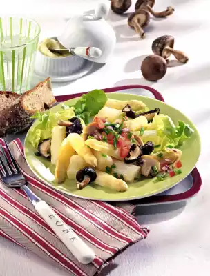 Fry the mushrooms and onion in 2 tablespoons of hot olive oil for about 4 minutes, turning them over. Season with salt and pepper. Drain the asparagus and let it drain. Cut tomatoes into quarters, remove seeds and dice the flesh. Cut chives into small rolls