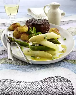 Pluck the leaves from the stems, except for something to garnish. Remove the asparagus and sprinkle with vinaigrette. Season steaks with pepper. Arrange asparagus, potatoes and steaks on plates. Sprinkle with marjoram and garnish.