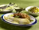 Cut the woody ends off the asparagus spears. Cut the asparagus spears in three. Cook white asparagus in boiling salted water for about 15 minutes. After about 10 minutes add the green asparagus. Dab the meat dry and season with salt.