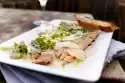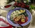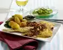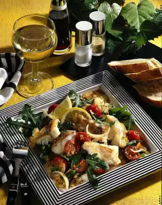 Sprinkle with vinegar and olive oil and season with salt and pepper. Put them on a plate together with the warm fish cubes and serve garnished with the rocket leaves and lemon wedges. Fresh baguette tastes good with it.